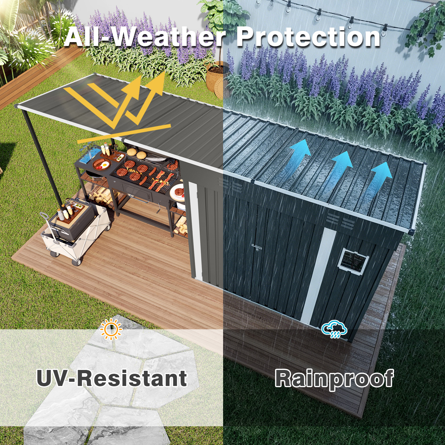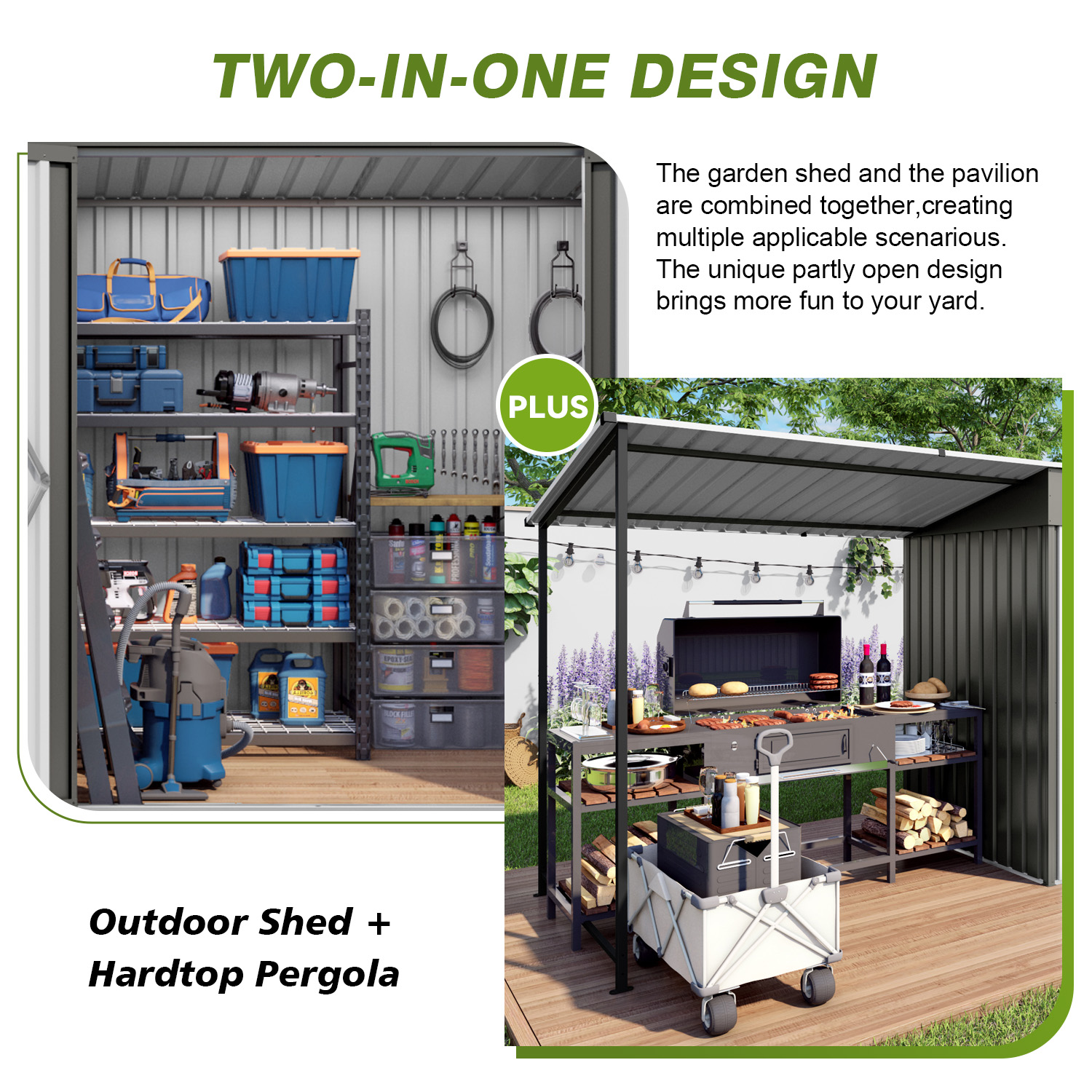 - 2-in-1 Storage & Shade Combo: Lockable enclosed space stores tools, bikes and seasonal items; open pergola offers shaded area for seating, BBQ and outdoor leisure activities.