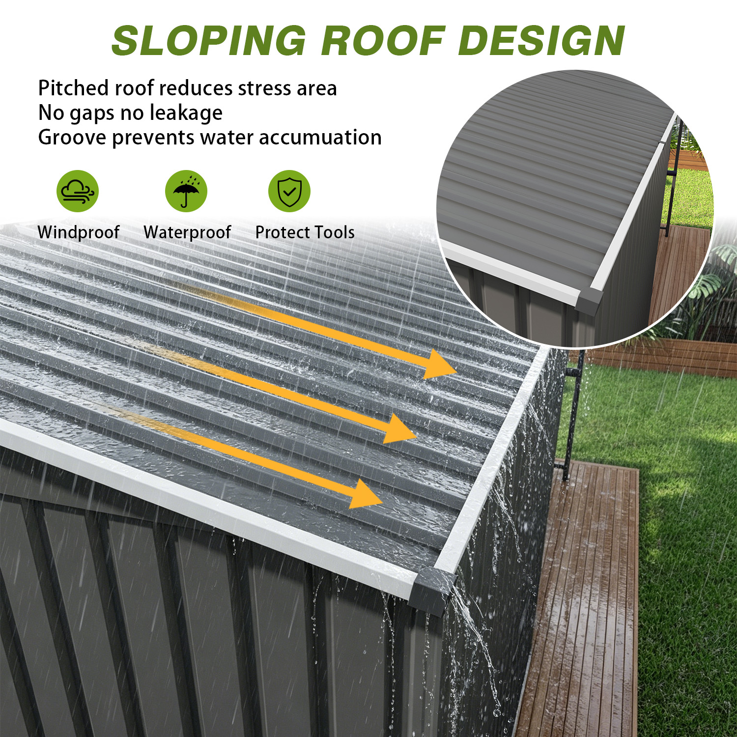- All-Weather Sloped Roof Protection: Sloped design drains rainwater fast and blocks UV rays. The matched pergola withstands seasonal changes, ensuring reliable year-round use in various weather.