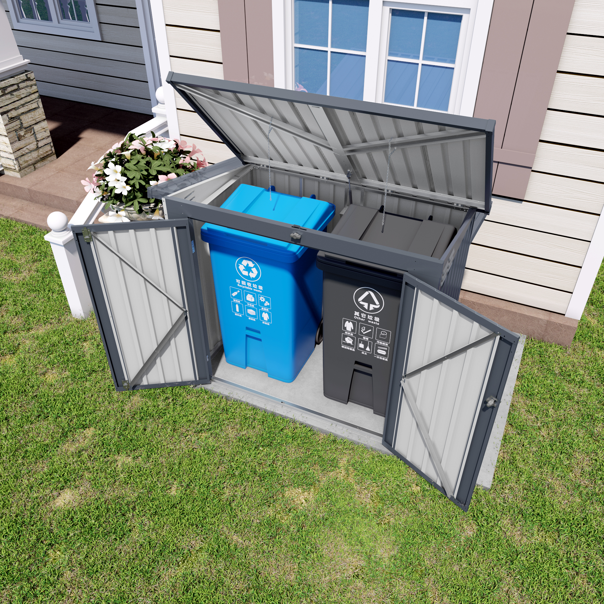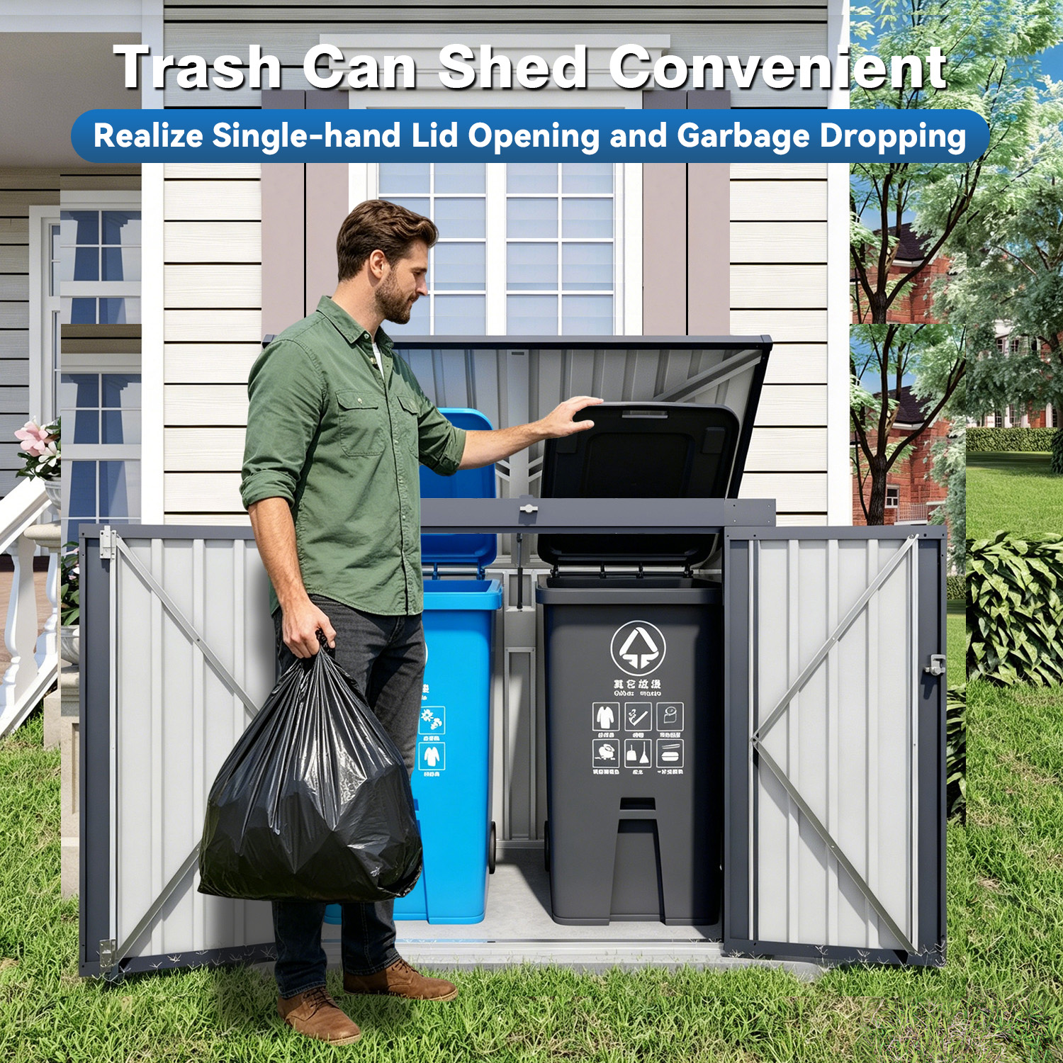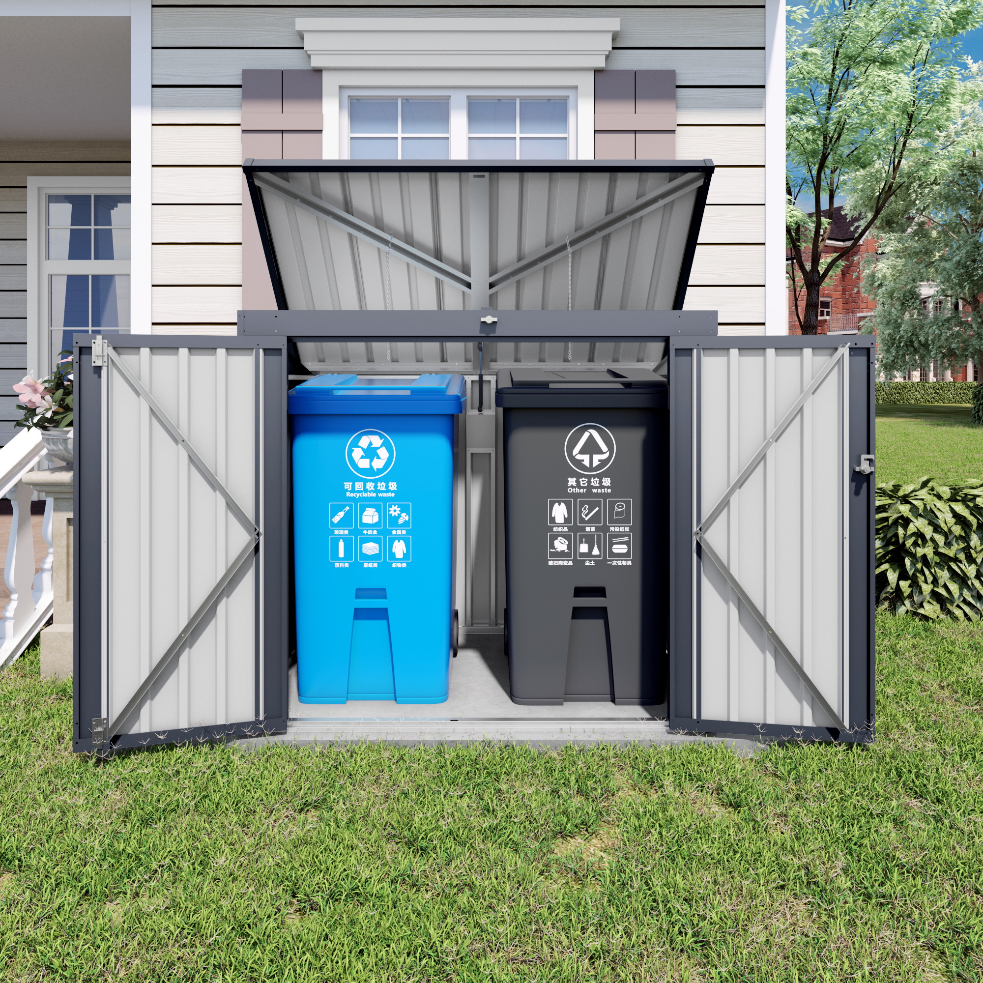 - Hassle-Free & User-Friendly DesignFeatures :a convenient gas spring strut for effortless opening of the top lid. A built-in top chain allows you to lift the trash can lid without direct contact, ensuring cleanliness and hygiene while keeping the shed closed securely.