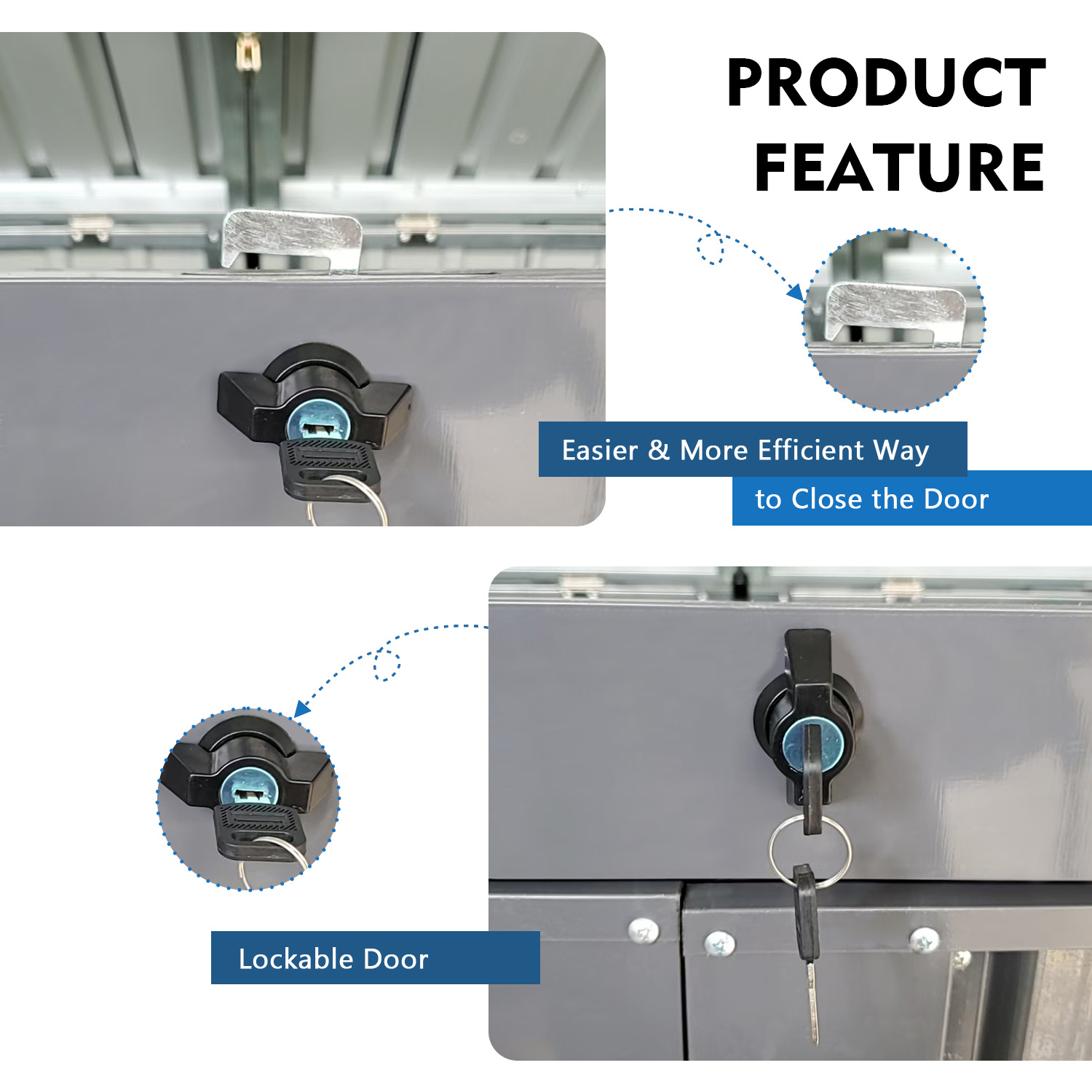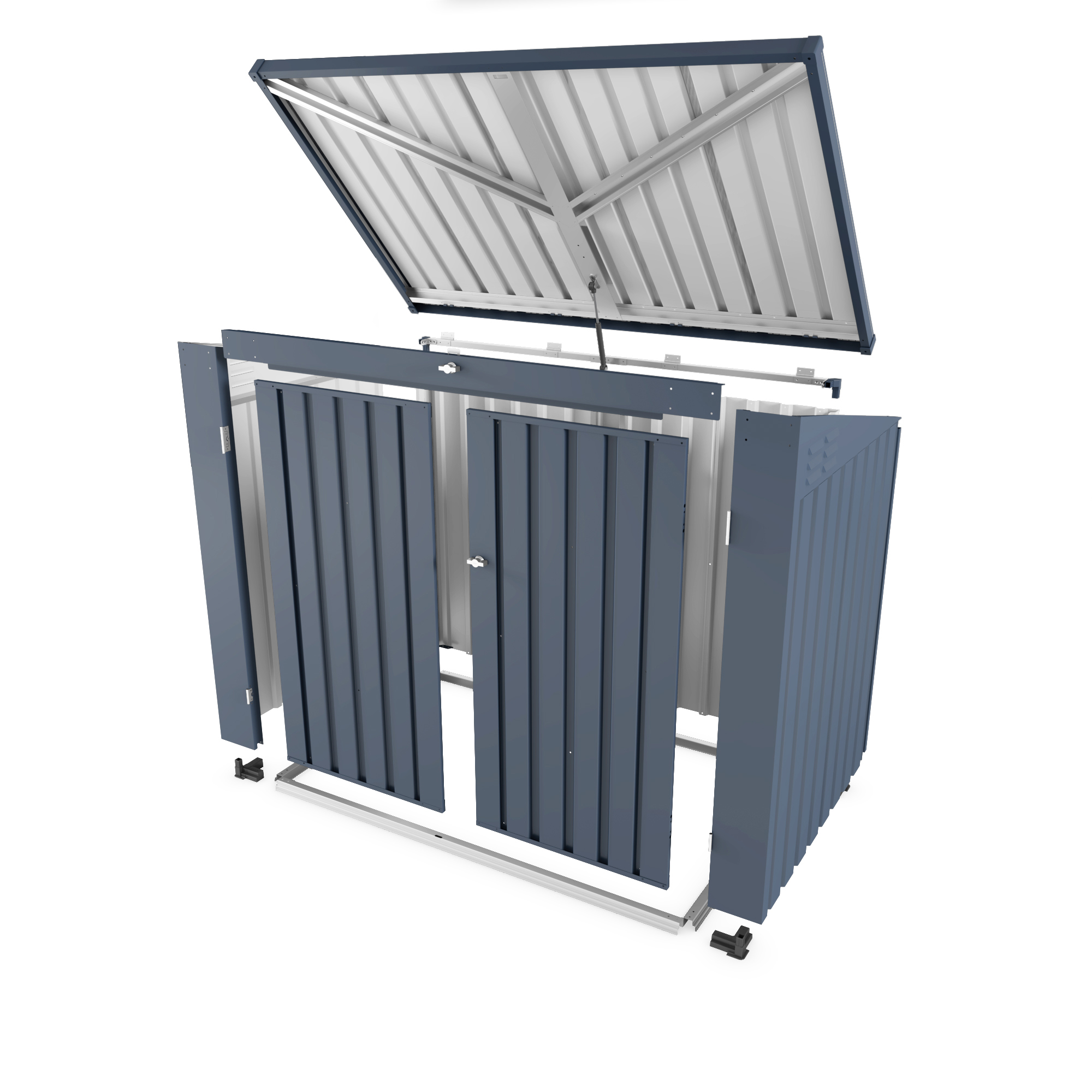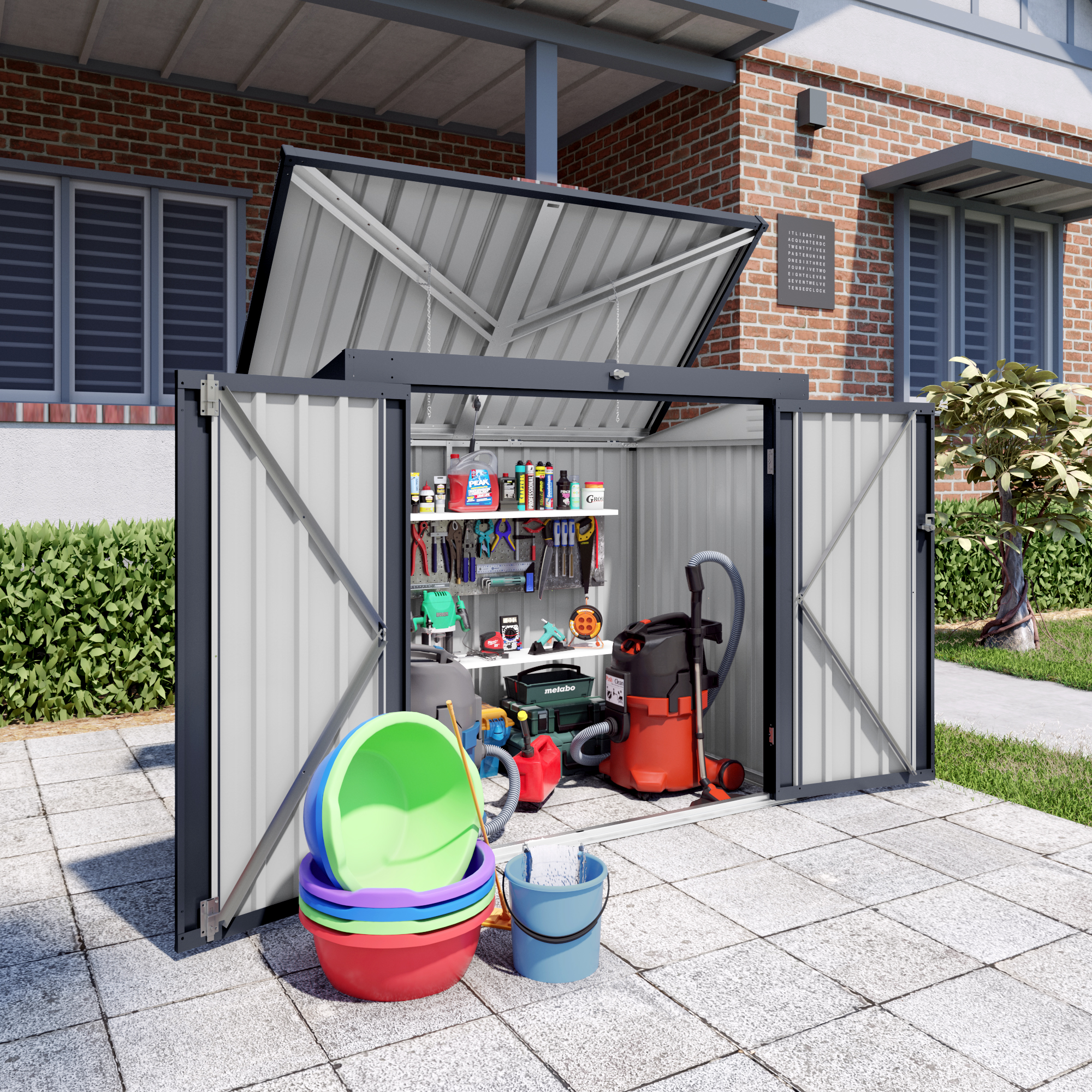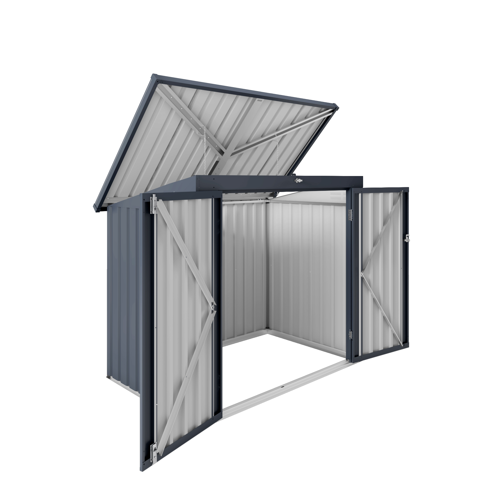 - Hassle-Free & User-Friendly DesignFeatures :a convenient gas spring strut for effortless opening of the top lid. A built-in top chain allows you to lift the trash can lid without direct contact, ensuring cleanliness and hygiene while keeping the shed closed securely.