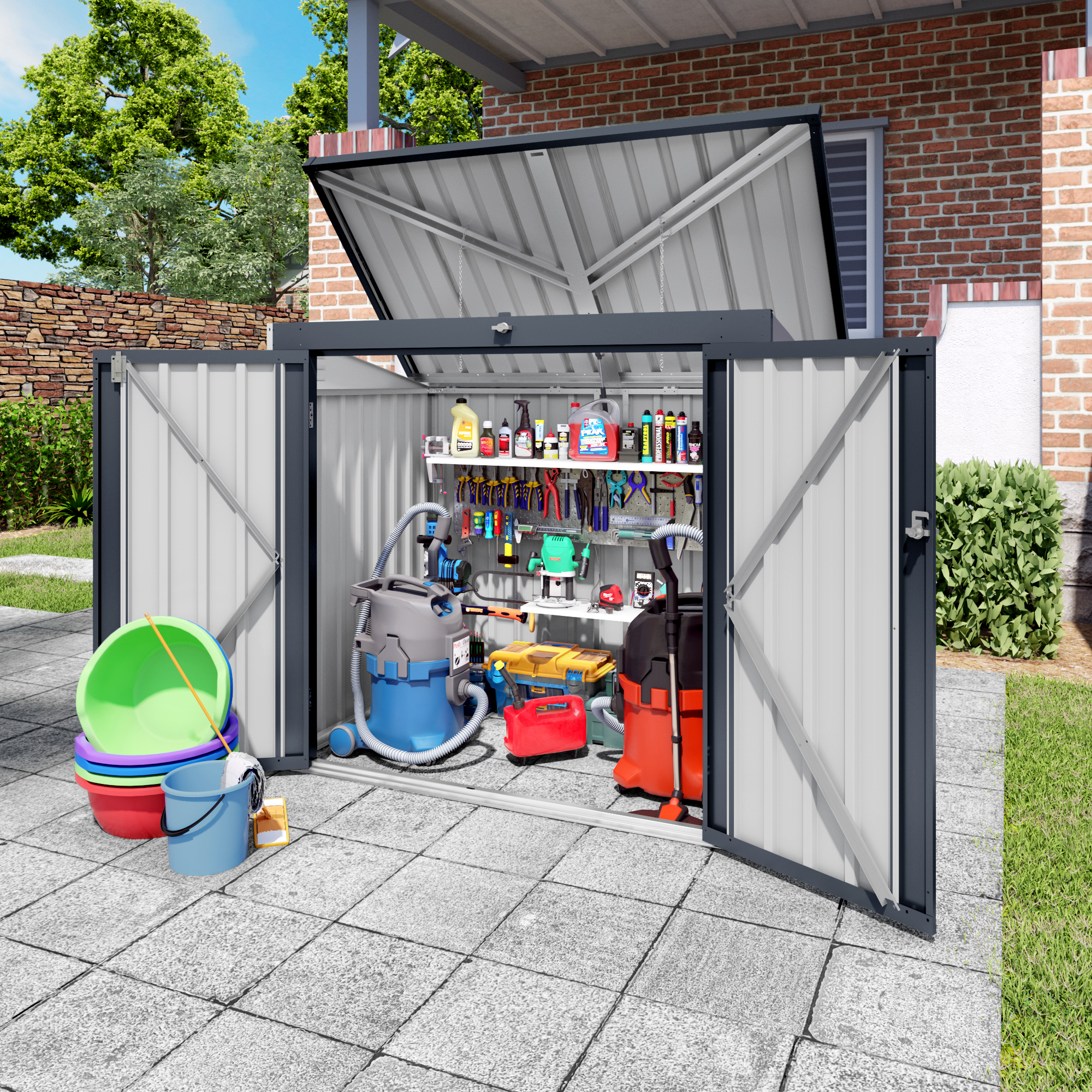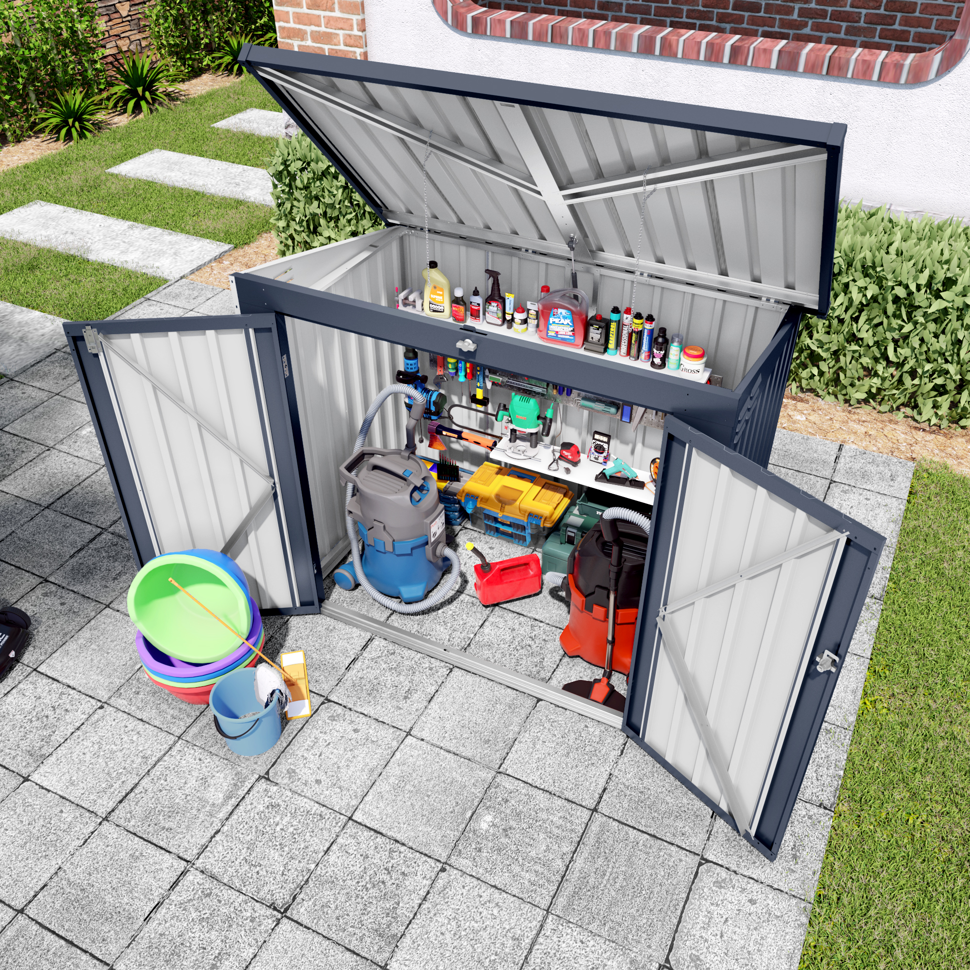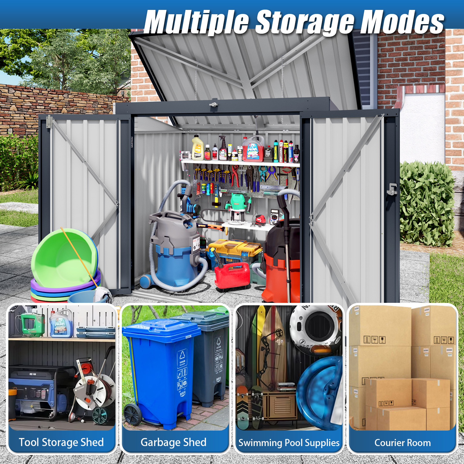 - Spacious Multi-Functional Storage Space:Equipped with dual front doors and a removable top cover, this outdoor shed offers flexible access with multiple latches for secure locking. The generous internal capacity keeps your yard tidy by safely storing bicycles, garden tools, gardening equipment, and trash cans.