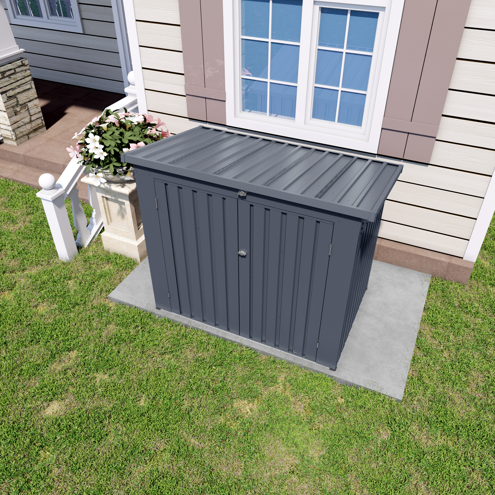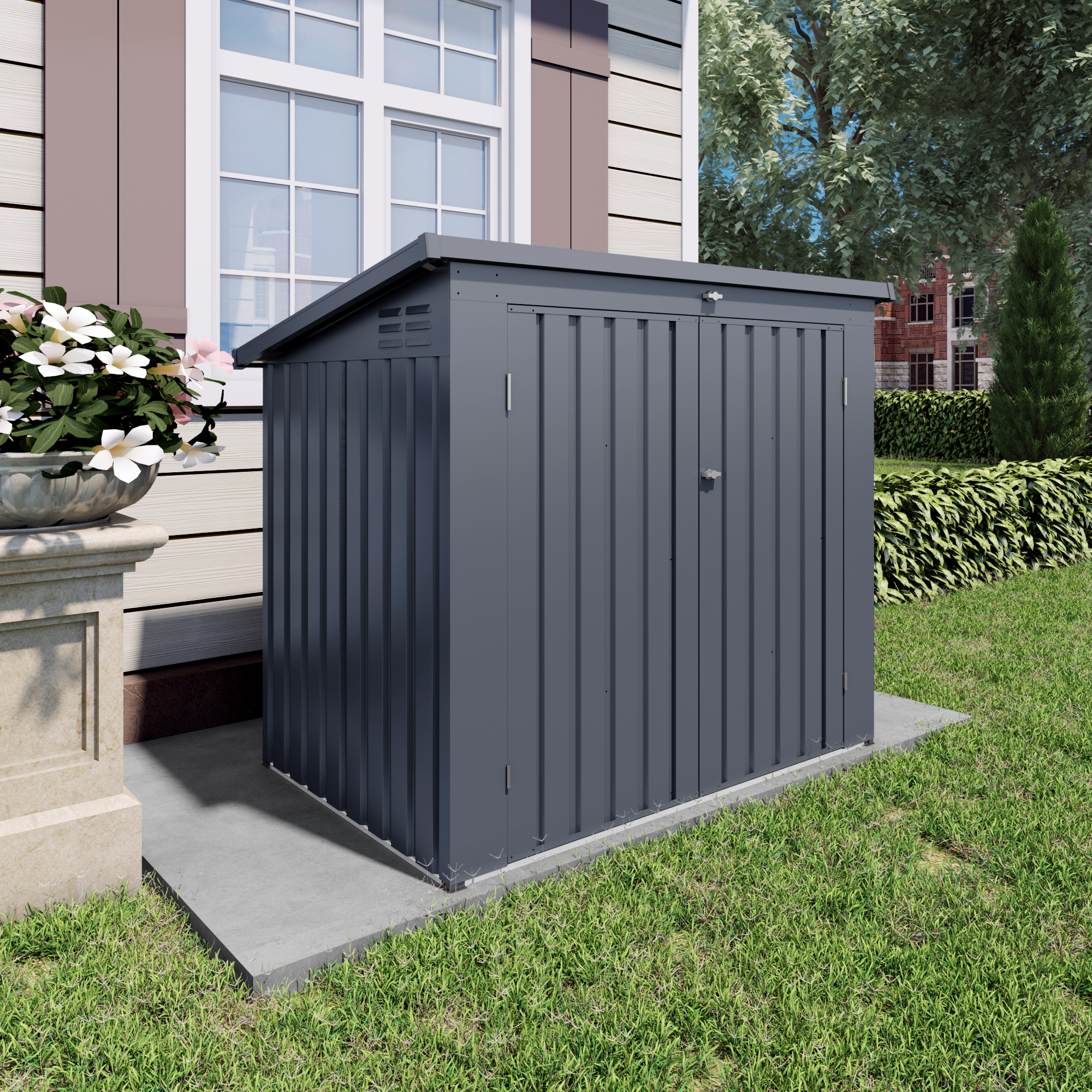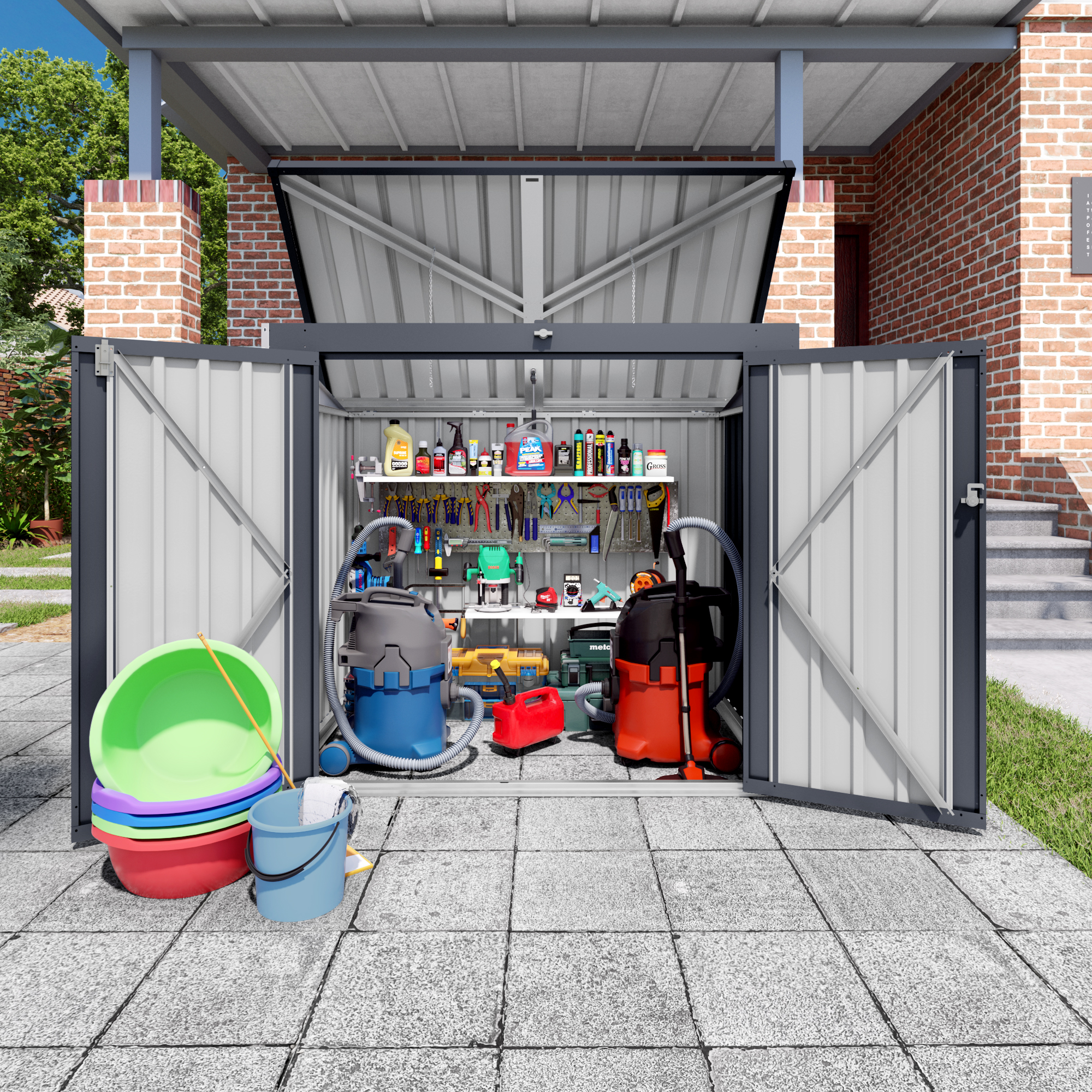 - Spacious Multi-Functional Storage Space:Equipped with dual front doors and a removable top cover, this outdoor shed offers flexible access with multiple latches for secure locking. The generous internal capacity keeps your yard tidy by safely storing bicycles, garden tools, gardening equipment, and trash cans.